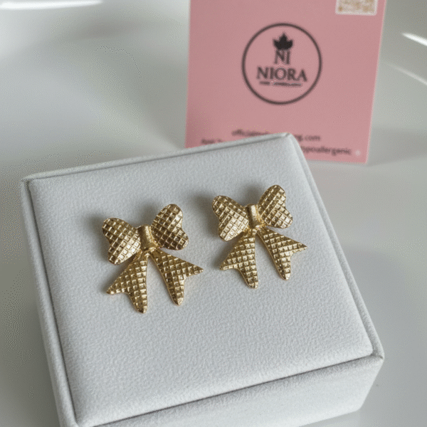 These earrings are elegant gold-tone stud earrings featuring a classic bow-tie design. The surface of the bow is characterized by a sophisticated textured, woven, or quilted finish, which catches the light beautifully and gives the piece a premium, non-flat appearance. The stud post ensures the bow sits neatly and securely against the earlobe, making them an ideal accessory for everyday wear or a subtle touch of feminine charm for any occasion.