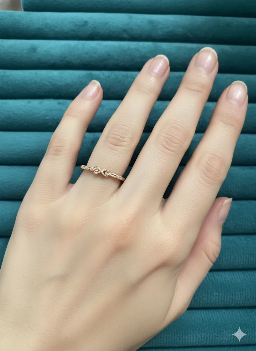 The Niora Eternal Knot Ring is a delicate expression of everlasting connection and refined elegance. Crafted in warm rose gold, this slim band features a subtle knot motif at its center, symbolizing unity, love, and continuity. Finely set micro-crystals line the band and knot, adding a soft, graceful sparkle that catches the light effortlessly. Designed to sit beautifully on the finger, this ring is perfect for everyday wear, stacking, or as a meaningful gift—timeless, feminine, and unmistakably Niora. ✨💍