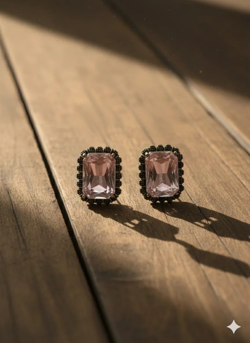A pair of elegant rectangular stud earrings featuring soft blush-pink faceted stones, delicately framed in an antique-finish metal setting. The earrings are placed on a warm wooden surface, bathed in natural sunlight that creates gentle shadows and highlights the gemstone’s clarity and depth. The composition feels organic, minimal, and timeless, evoking understated luxury and everyday elegance.